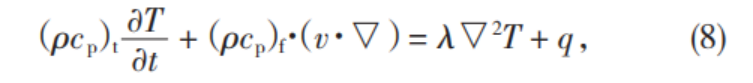 式(6)—式(7)中,ρ為密度,kg/m3;cp為比熱容,J(/kg·K);(ρcp)f為多孔介質(zhì)流相中總的體積比熱容,J/m3;T為溫度,K;t為時(shí)間,s;λf為液體導(dǎo)熱系數(shù),W(/m·K);qf為液體內(nèi)熱源強(qiáng)度,W;(ρcp)s為多孔介質(zhì)固相中總的體積比熱容,J/m3。將式(6)與式(7)相加,可導(dǎo)出單相流體的多孔介質(zhì)的能量方程為: