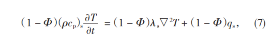 兩種能量增加帶來(lái)的溫升是基于多孔介質(zhì)材料內(nèi)的固體部分。假設(shè)固體部分的密度表示為ρs,其比熱容表示為cs。假定研究對(duì)象熱物性參數(shù),如比熱容、導(dǎo)熱系數(shù)等,不受到時(shí)間和空間改變帶來(lái)的影響,多孔介質(zhì)本身始終為各項(xiàng)同性的,并且多孔介質(zhì)材料內(nèi)部細(xì)小孔隙的容積均被流體填充,則有:
