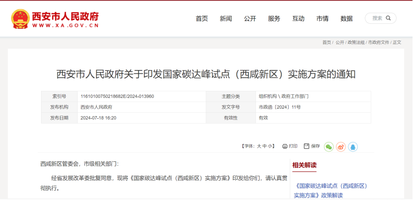 7月19日,西安市人民政府面向西咸新區(qū)管委會,市級相關(guān)部門印發(fā)《國家碳達峰試點(西咸新區(qū))實施方案》,聚焦綠色低碳發(fā)展的能源和產(chǎn)業(yè)轉(zhuǎn)型瓶頸制約,加快提升能源清潔化利用效率、基礎(chǔ)設(shè)施綠色低碳化水平和減污降碳協(xié)同能力,全面推動產(chǎn)業(yè)高質(zhì)量發(fā)展和資源循環(huán)利用。