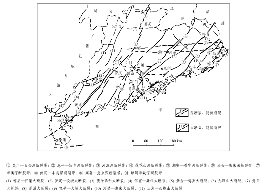 廣東省在大地構(gòu)造上屬華南褶皺系的一部分,其演化過程經(jīng)歷了三個(gè)發(fā)展階段及相應(yīng)的構(gòu)造旋回和構(gòu)造運(yùn)動(dòng):加里東運(yùn)動(dòng)形成緊密線型褶皺,主要呈NEE方向,成為廣東省構(gòu)造骨架的基礎(chǔ);印支運(yùn)動(dòng)形成多方向的過渡型蓋層褶皺;燕山運(yùn)動(dòng)以斷塊造山、NE向和EW向深大斷裂控制的火山噴發(fā)、巖漿侵入為主。深大斷裂對(duì)廣東省的沉積建造、巖漿活動(dòng)、變質(zhì)作用和成礦作用有較明顯的控制。主要的深斷裂有吳川-四會(huì)、恩平-新豐、河源、蓮花山、潮安-普寧、汕頭-惠來、南澳、佛岡-豐良、高要-惠來、瓊州海峽等,主要的大斷裂有郴縣-懷集、羅定-悅城、貴子、信宜-廉江、紫金-博羅、九峰山、貴東、遂溪、饒平-大埔、河婆-惠來、三洲-西樵山等。這些深大斷裂都具有規(guī)模大、活動(dòng)時(shí)間長(zhǎng)等特點(diǎn)。從總體上看。廣東省境內(nèi)大型褶皺和深大斷裂以NE向?yàn)橹?,間夾EW向和NW向構(gòu)造組成復(fù)雜的構(gòu)造圖景。